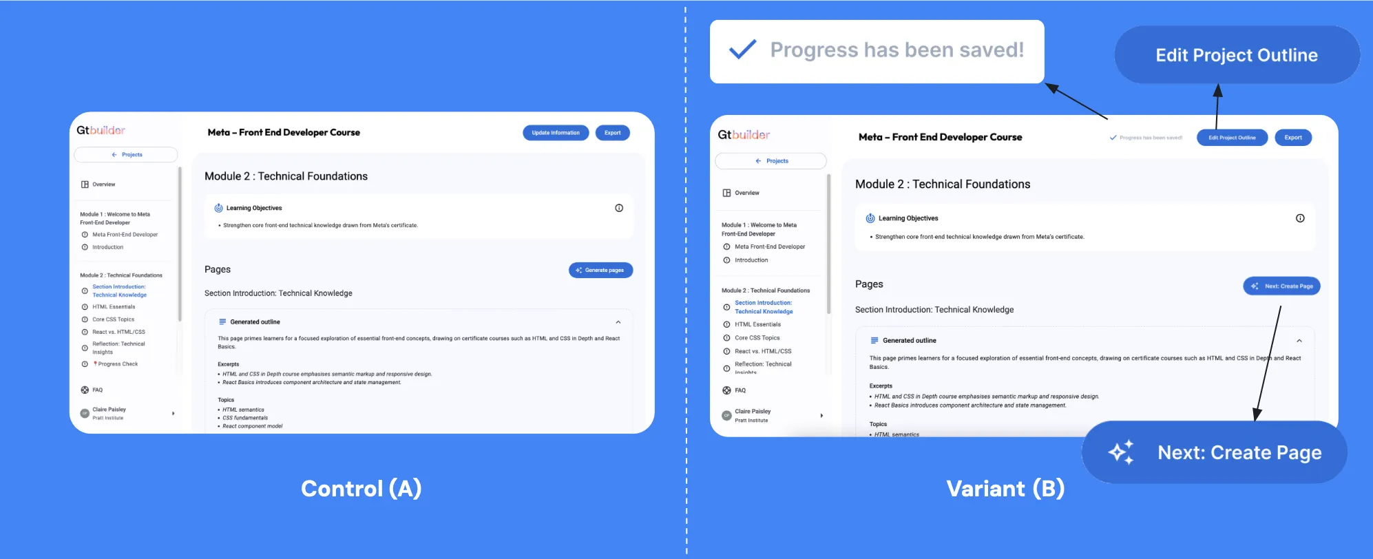 An A/B test can help determine whether updated button wording (“Edit Project Outline,” “Next: Create Pages”) and the addition of a “Save” status indicator measurably improve user clarity and task success.